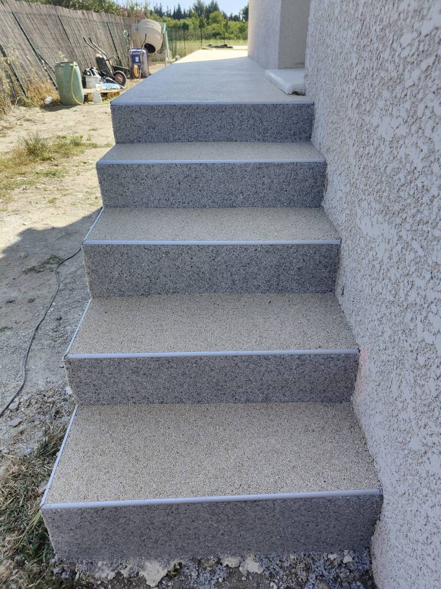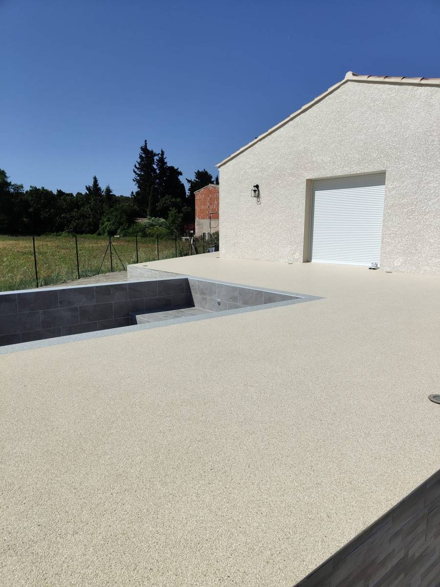 À Salon-de-Provence, ce contour de piscine a été entièrement aménagé en moquette de pierres, une solution à la fois esthétique et fonctionnelle. Composée de granulats de marbre liés par une résine drainante, cette surface offre un rendu naturel, moderne et parfaitement adapté aux abords de bassin.