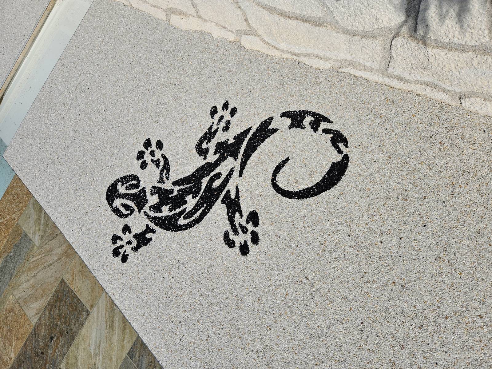 Le revêtement en pierre naturelle a été soigneusement posé pour épouser parfaitement les lignes de la piscine, tout en garantissant une résistance optimale aux intempéries et à l’usage quotidien. Pour donner à ce projet une touche d’originalité et d’élégance, nous avons intégré deux motifs emblématiques :