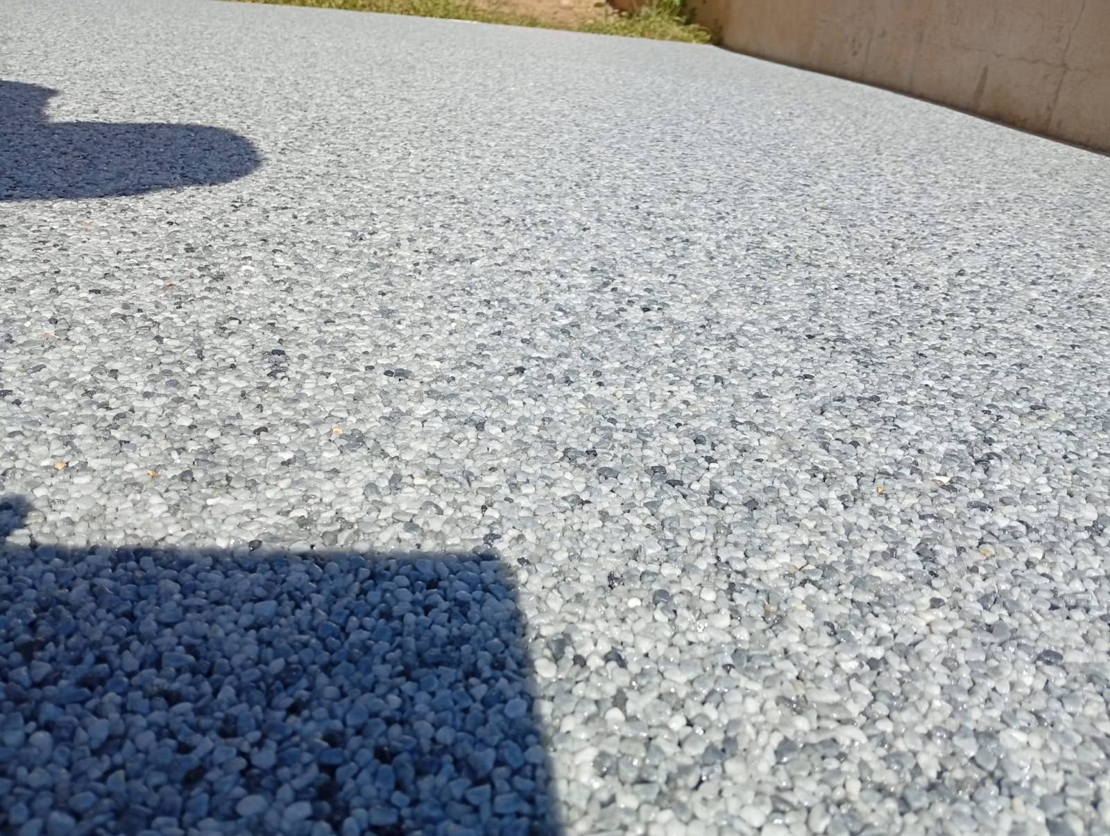 Pose du tapis de marbre (granulats naturels et résine drainante), finition soignée dans des tons clairs adaptés à l’environnement.